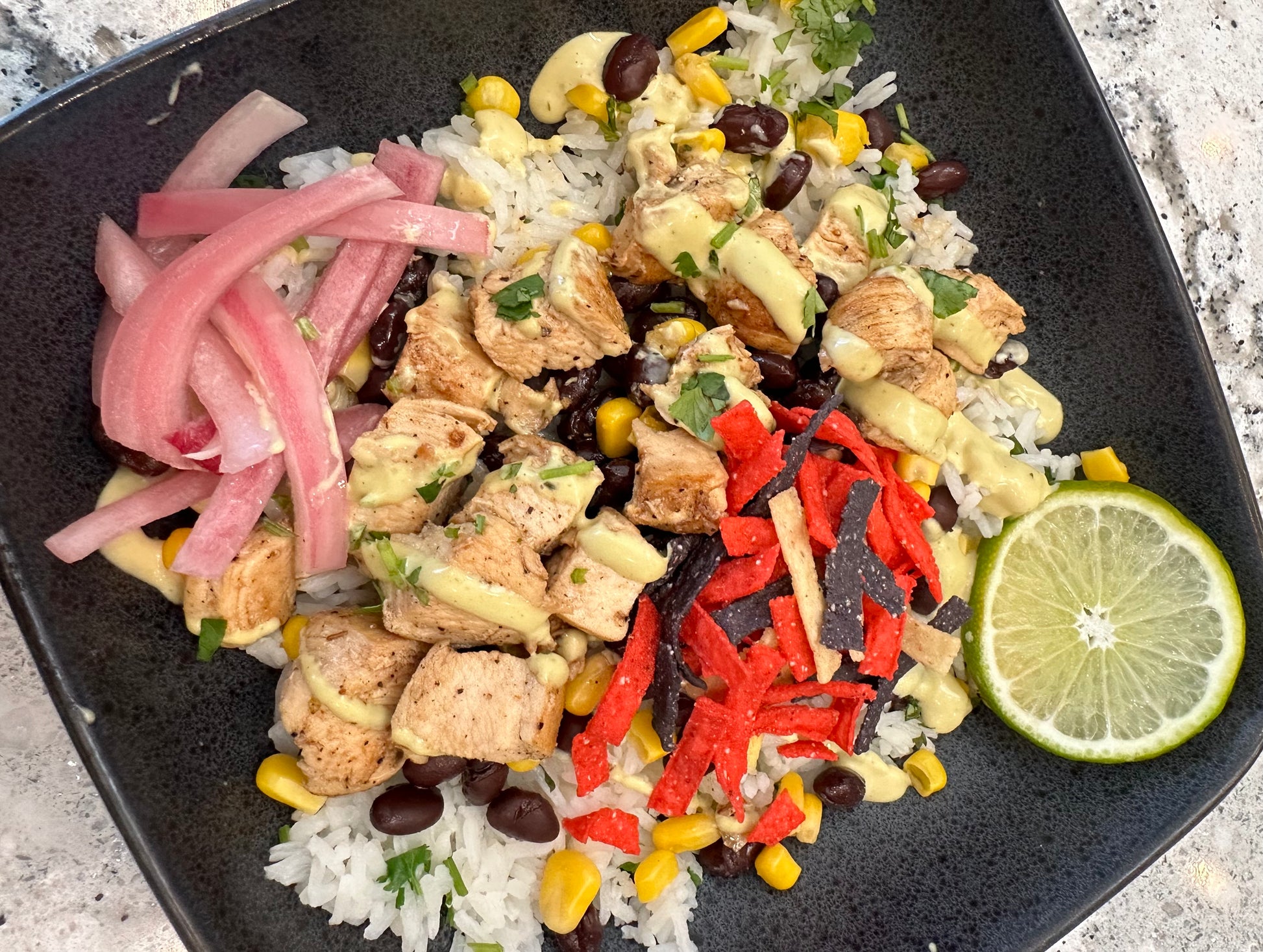 Grilled chicken atop a bed of zesty cilantro lime rice. This vibrant dish is complemented by corn, beans, pickled onions, crispy tortilla strips for added crunch and a lime wedge adds a refreshing touch, while a side of creamy avocado ranch dressing elevates every bite.